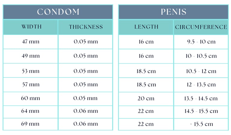 Sizes 47 and 49 will best suit those whose penis is about 16 centimetres in length and about 9.5 - 10.5 centimetres in circumference, and sizes 53 and 57 will best suit those whose penis is about 18.5 centimetres in length and about 10.5 - 13.5 centimetres in circumference. Size 60 will best suit those whose penis is about 20 centimetres in length and 13.5 - 14.5 centimetres in circumference, while sizes 64 and 69 will best suit those whose penis is about 22 centimetres in length and 14.5 - 15.5 centimetres in circumference.